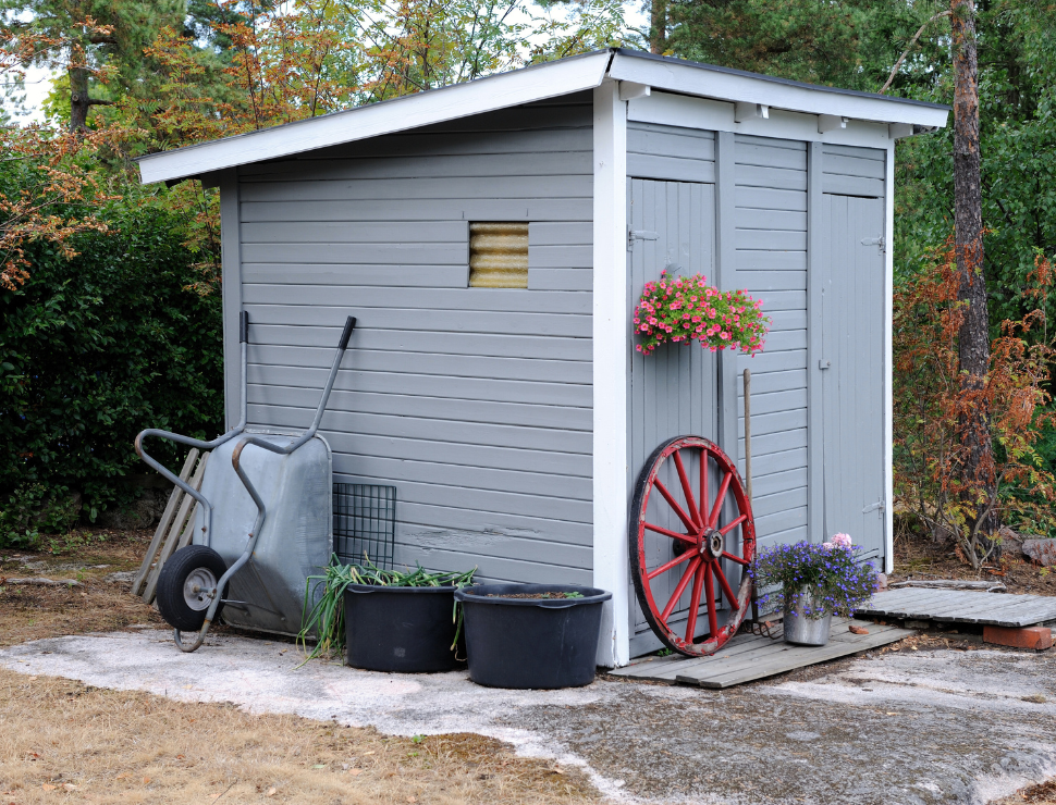 Cette image met en valeur un charmant abri de jardin en bois gris, situé dans un jardin luxuriant et arboré. Doté d'un toit en pente et de portes doubles, il est orné d'un charmant panier à fleurs suspendu qui apporte une touche de rose. Une roue de chariot rouge vintage s'appuie contre l'abri, contribuant à son esthétique rustique. Devant l'abri, deux bacs noirs remplis de plantes vertes récoltées sont disposés, à côté d'une brouette en métal. Un petit pot de fleurs aux fleurs violettes et une plateforme en bois façon palette complètent la décoration. Entouré d'arbres et de verdure, ce jardin paisible allie fonctionnalité et charme rustique.